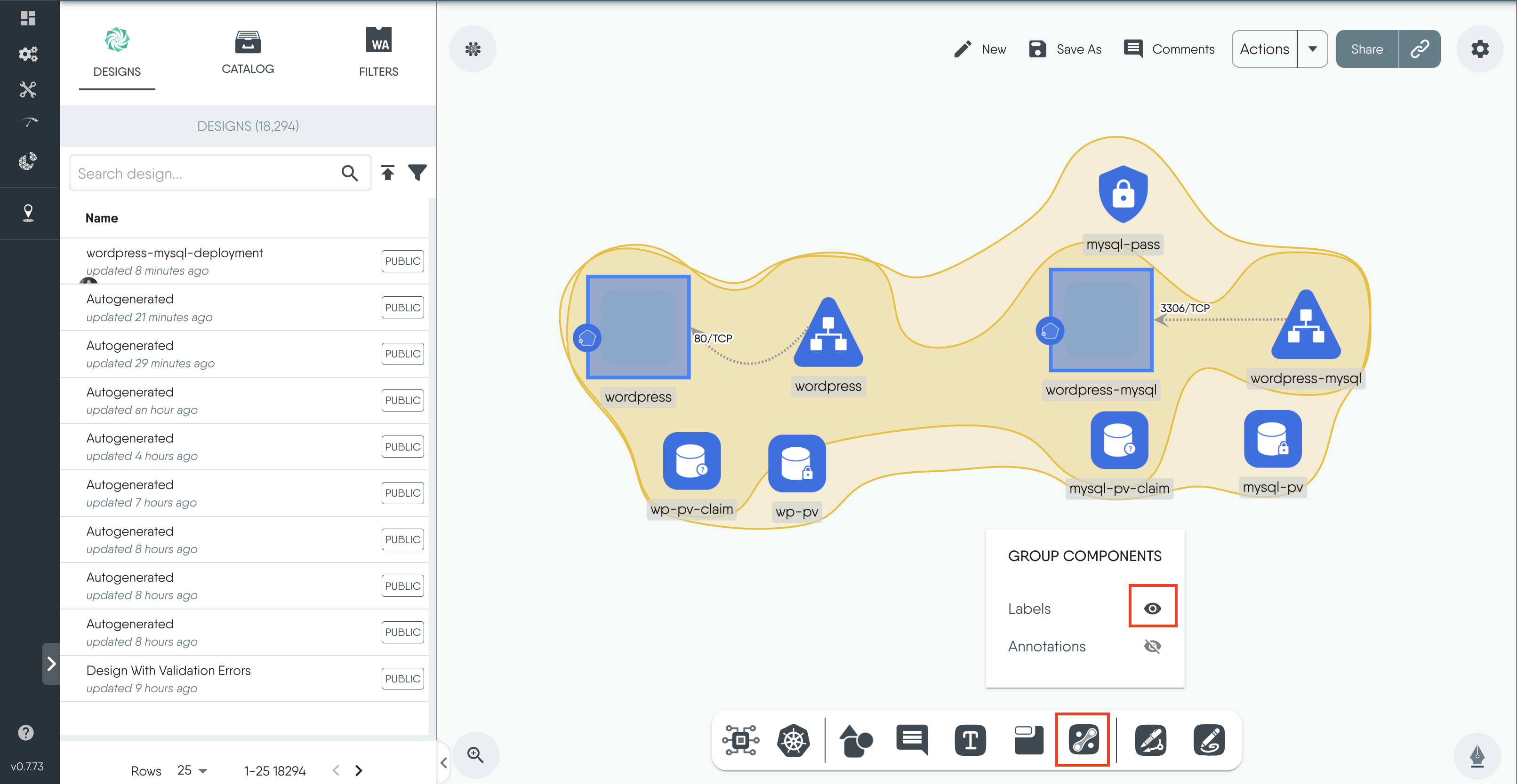 Save As and save the design.The Group Components icon on the dock below allows you to group resources based on shared labels or annotations.